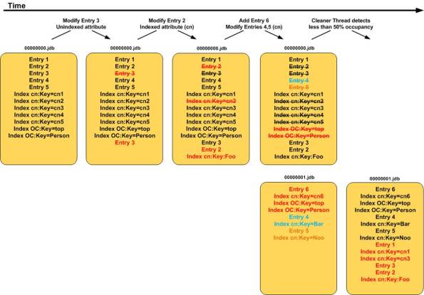 Changes made to data entries containing indexed attributes would not only appear at the end of the log, but the modifications to the indexes would appear there as well. This can be seen in the third log (row 1, column 3). Entry 2 was modified and the change involved a modification to the common name (cn) attribute. Note how the previous index value for this entry is marked for deletion and the new index entry is written to the end of the log.